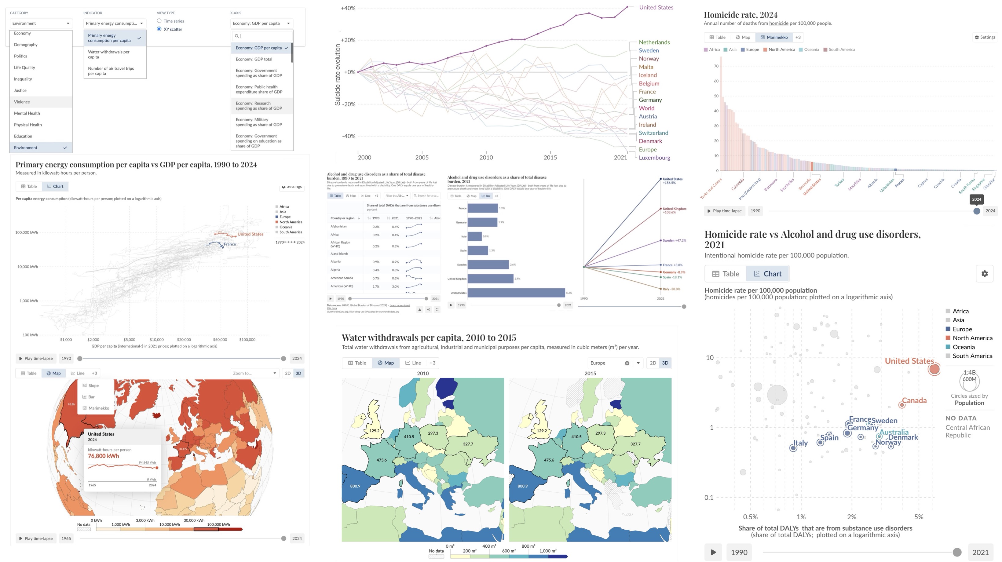 We therefore have both robust data and advanced technical capabilities to visualize them (international comparisons, time-series analyses, maps, dynamic trajectories, etc.) and to study them (multivariable correlations, causal modeling, projections, etc.). Yet holistic analysis of contemporary societies remains surprisingly underdeveloped in academic and public discourse: the data and tools exist, but there is no widely adopted platform to cross-reference, explore and interpret them together.